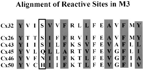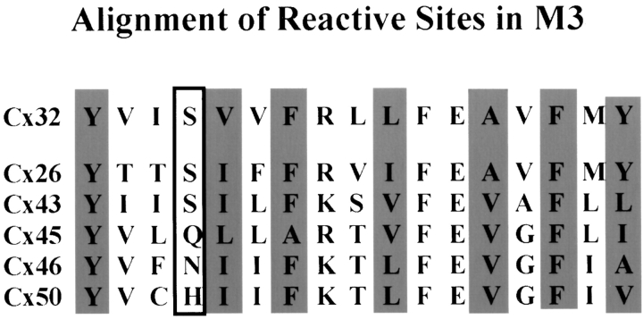 Figure 10. Aligned amino acid sequences for the third transmembrane domain of Cx32 and several other connexins. Highlighted residues indicate pore-lining residues in Cx32 and their corresponding sites in other characterized connexins (open-boxed site only tested in the closed state). The periodicity in the NH2-terminal two-thirds of M3 suggests α-helix, but this breaks down at the COOH-terminal end. Many sites are strictly conserved, whereas others show relatively minor changes despite reports of significant differences in permeability between connexins. This suggests that subtle differences in residue length or branching may define the affinity of binding sites within the pore.