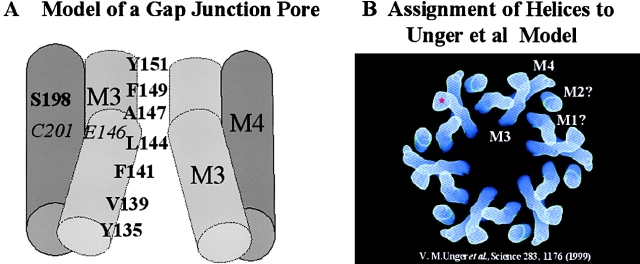 Figure 9. Models of the pore-lining helices of connexins showing reactive sites and the proposed assignment of helices in the gap junction structure. (A) Reactive sites span the length of the M3 helix, which appears to lose its helical periodicity at its extracellular end (displayed as a “break” in the helix). The positioning of M4 is based on the observation that a disulfide bond is capable of forming between C201 in M4, and a substituted cysteine at position 146 in M3. (B) Helical assignments to the gap junction structure of Unger et al. (1999). The main pore-lining helix (M3) is assigned with certainty based on the accessibility of M3 residues in both open and closed channels. The M4 assignment is based on evidence for disulfide formation. There is less certainty regarding the assignments of M1 and M2. It has been proposed (see Discussion; Helical assignments) that the structure shown in B is in the closed state, where M1 would contribute to the pore at the widened cytoplasmic mouth. However, our data indicate that M2 would contribute to the pore mouth in the open state.