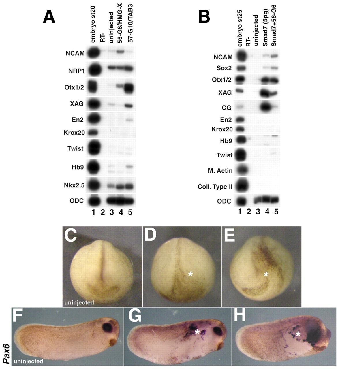 Fig. 6. Functional analysis of clones 56-G6/HMG-X and 57-G10/TAB3 in animal cap explants. (A) Clones 56-G6/HMG-X and 57-G10/TAB3 were injected into animal caps and analyzed for fate changes at stage 20. Both clones induce neural or cement gland marker expression. Notice no induction of posterior neural markers (En-2, mid/hindbrain; Krox-20, hindbrain; twist, neural crest) and weak induction of the heart marker xNkx2.5. (B) 56-G6/HMG-X synergizes with low amounts of Smad7 (5 pg). Notice inhibition of cement gland fates induced by Smad7 in the presence of 56-G6/HMG-X (lane 5). (C-H) Gain-of-function experiments with 56-G6/HMG-X in vivo. Embryos were injected into 1/2 cells in the animal pole and embryos analyzed at tadpole stages. Notice enlargement of the anterior neural plate (C-E), and ectopic expression of the anterior neural marker Pax6 (F-H). Asterisks indicate enlarged anterior neural territory (D,E) and ectopic Pax6 expression (G,H).