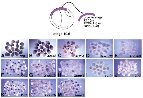 Fig. 2. Specification assays on dorsal ectoderm (DE) of stage 10.5 embryos. DE was explanted as outlined in the scheme, grown to stage 12.5. (J), to stage 22/23 (A-I) or to stage 30/31 (K-M), and finally processed for in situ hybridization with probes for nrp1, Xotx2, XBF-1, Xrx1, Xvax1b, Xemx1, Xkrox20, XhoxB9, cardiac actin and chd as indicated.
