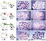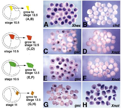 Fig. 3. Characterization of different fragments of dorsal mesendoderm used in recombination experiments. Fragments were reproducibly dissected from stage 10.5 (A-F) or stage 11 (G,H), as shown in the scheme, cultured to stage 12.5, and assayed for expression of the organizer marker genes Xhex (A), chd (B), gsc (C,E,G) and Xnot (D,F,H).