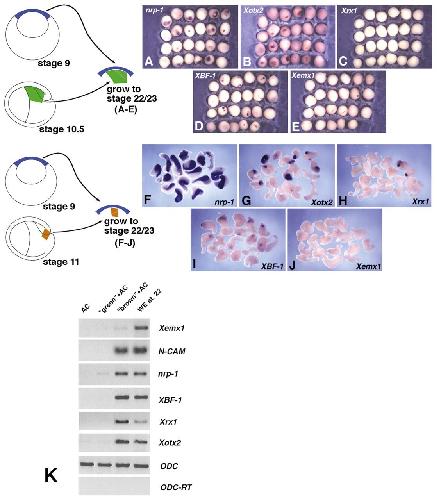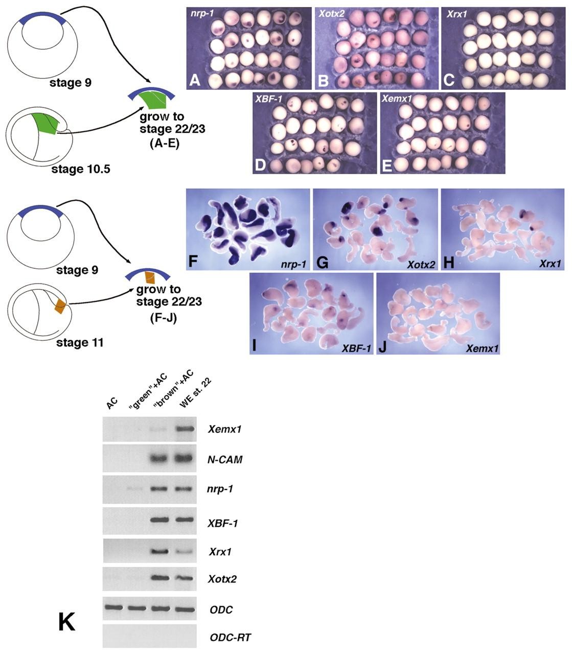 Fig. 4. Tissue recombination induction assays. Conjugates were made by recombining stage 9 animal caps with the involuted anterior dorsal mesendoderm (ADME, green) of stage 10.5 embryo (A-E, upper scheme on the left) or with the presumptive notochordal fragment (brown) of stage 11 embryo (F-J, lower scheme on the left). Conjugates were grown to stage 22/23 and assayed by in situ hybridization for expression of the neural markers nrp1 (A,F), Xotx2 (B,G), Xrx1 (C,H), XBF-1 (D,I), Xemx1 (E,J). (K) RT-PCR analysis of the expression of neural markers in similar conjugates: AC, animal caps; WE, whole embryo; `green' and `brown' correspond to the colored fragments in the schemes.