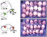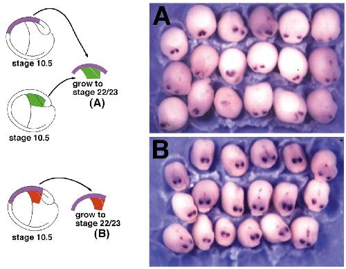 Fig. 5. The involuted ADME of stage 10.5 embryo acts on stage 10.5 DE to elicit proper Xemx1 expression at stage 22/23. (A) DE (violet) and involuted ADME (green) were explanted and recombined at stage 10.5 (upper scheme), grown to stage 22/23 and assayed for Xemx1 expression. (B) DE and the underlying involuted ADME (red) were explanted together at stage 10.5 (lower scheme), grown to stage 22/23 and assayed for Xemx1 expression.