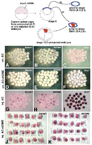 Fig. 8. The involuted ADME of stage 10.5 embryo can trigger expression of the dorsal telencephalic markers Xemx1 and eomes in chd injected animal caps. Animal caps (blue in schematic) from stage 9 uninjected (A-F) or injected (G-K) embryos were explanted, conjugated in pairs either without (A-C;G-I) or with (D-F,J,K) the ADME (red) from a stage 10.5 gastrula and grown to stage 30/31. Injected animal caps never express either Xemx1 (G) or eomes (H), but show activation of a control neural marker, Xrx1 (I). chd-injected caps conjugated with the ADME show activation of both Xemx1 (J) and eomes (K), whereas no activation of these genes or of Xrx1 is detected in conjugates between ADME and uninjected animal caps (D-F). Uninjected caps never show expression of Xemx1, eomes or Xrx1 (A-C).