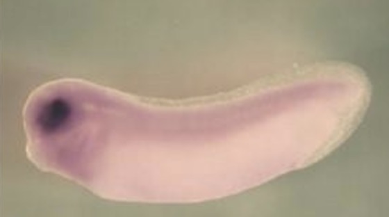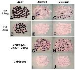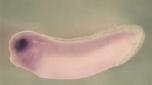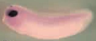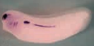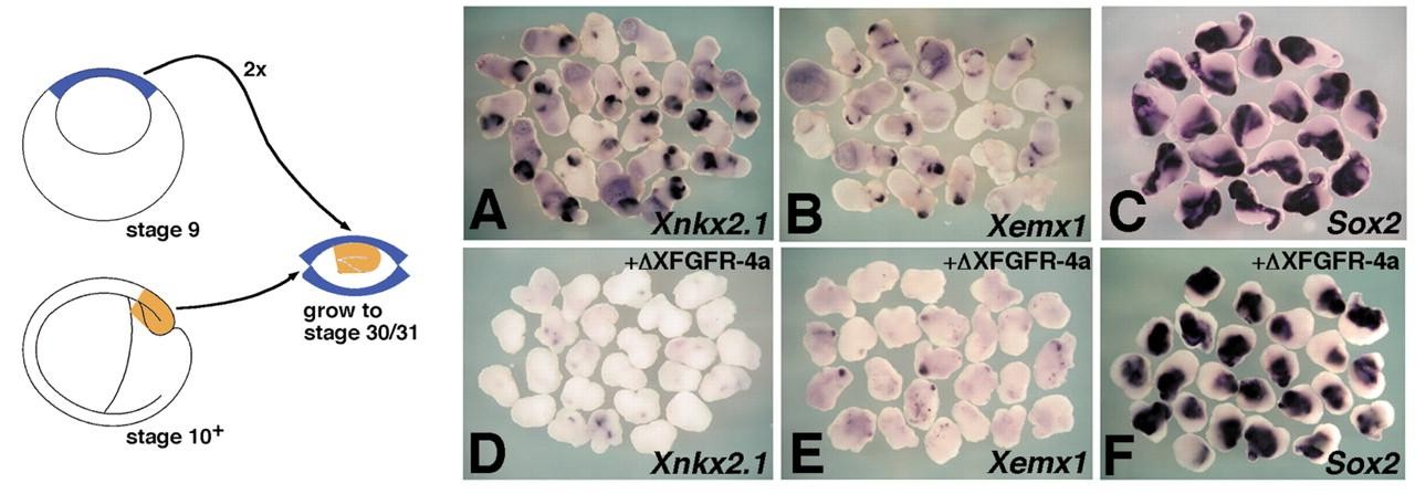 Fig. 12. FGF signaling is required for telencephalic gene expression. As shown in the schematic, the early dorsal blastopore lip (brown) of a stage 10-10+ gastrula was sandwiched either between two uninjected stage 9 animal caps (A-C) or animal caps injected with δXFGFR-4a (320 pg/blastomere) (blue) in all four animal blastomeres of eight-cell stage embryos (D-F). Conjugates were grown to stage 30/31 and assayed for expression of Xnkx2.1 (A,D), Xemx1 (B,E) or Sox2 (C,F).