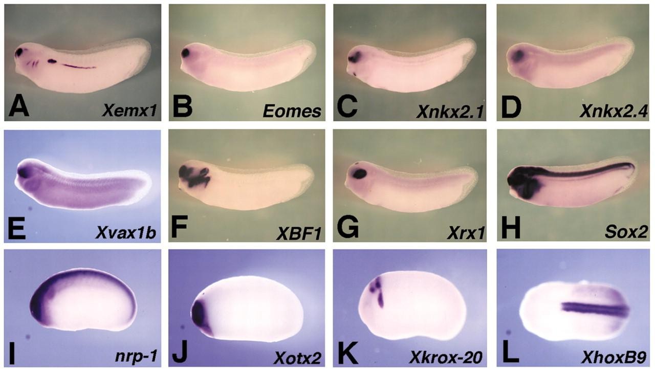 Fig. 1. Expression patterns of the neural markers used in this study, as detected by whole-mount in situ hybridization at stage 30/31 (A-H) or stage 22/23 (I-L). (A-K) lateral views; (L) dorsal view.