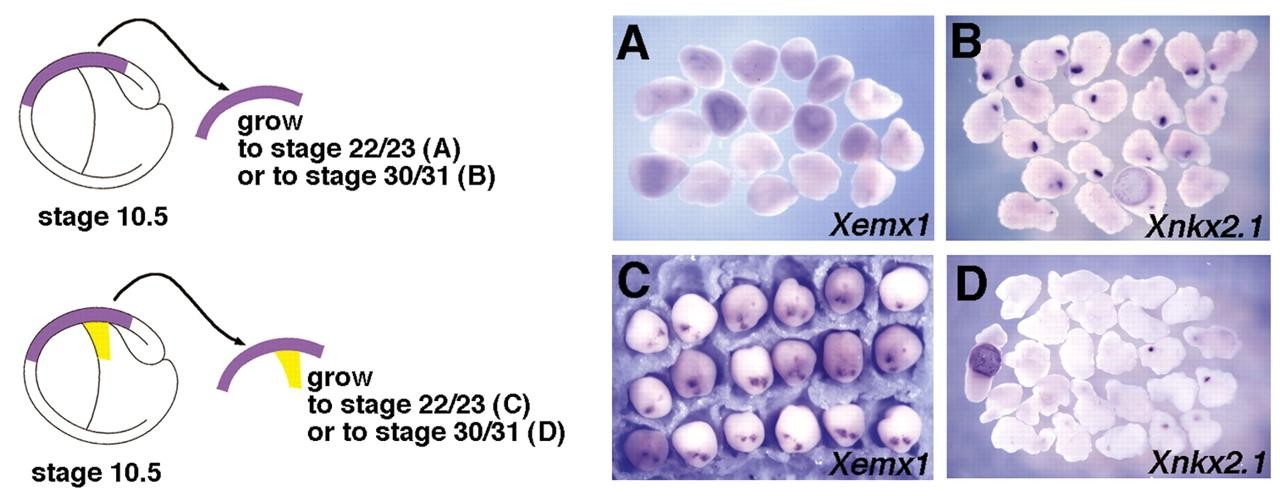 Fig. 6. The ADE promotes Xemx1 expression and downregulates Xnkx2.1 expression in explants of DE. (A,B) DE (violet in upper schematic) was explanted from stage 10.5 embryos, cultured to stage 22/23 (A) or 30/31 (B) and assayed for expression of Xemx1 (A) or Xnkx2.1 (B). (C,D) DE (violet in lower schematic) was explanted from stage 10.5 embryos together with the ADE (yellow in lower schematic), grown to stage 22/23 (C) or 30/31 (D), and assayed for expression of Xemx1 (C) or Xnkx2.1 (D).