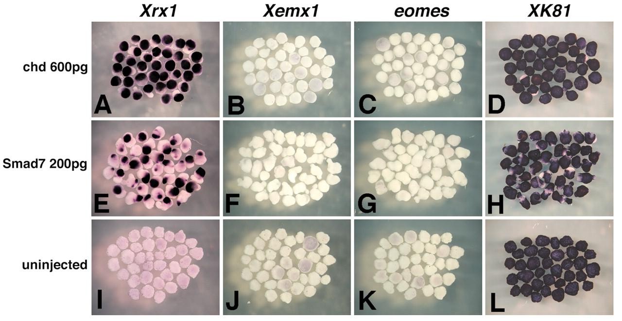 Fig. 7. Injection of chordin or of Smad7 mRNA cannot induce expression of the dorsal telencephalic markers Xemx1 and eomes in animal cap assays. Animal caps from stage 9 embryos injected with 600 pg chordin mRNA (A-D), or with 200 pg Smad7 mRNA (E-H), or from uninjected embryos (I-L) were dissected, grown in pairs to stage 30/31 and assayed for expression of Xrx1, Xemx1, eomes and XK81 as indicated. (I-L) are uninjected control caps.