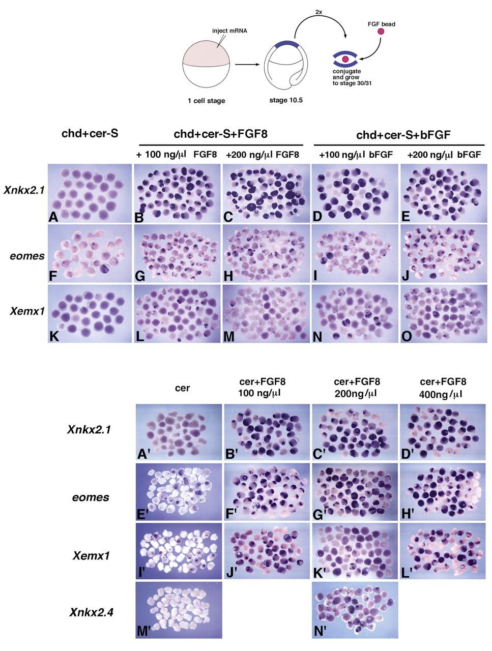 Fig. 11. FGF effect on neuralized animal caps. As shown in the scheme, animal caps were dissected from stage 10.5 embryos injected either with chordin (660 pg)+cer-S (2 ng) mRNA (A-O), or with cerberus mRNA (2 ng) (Aâ²-Nâ²), and recombined in pairs either without addition of FGF-soaked beads (A,F,K,Aâ²,Eâ²,Iâ²,Mâ²) or with FGF-soaked beads (B-E,G-J,L-O,Bâ²-Dâ²,Fâ²-Hâ²,Jâ²-Lâ²,Nâ²). After reaching stage 30/31, they were processed by in situ hybridization for the expression of Xnkx2.1 (A-E,Aâ²-Dâ²), eomes (F-J,Eâ²-Hâ²), Xemx1 (K-O,Iâ²-Lâ²) or Xnkx2.4 (Mâ²,Nâ²). Concentrations used for FGF8 were 100 ng/μl (B,G,L,Bâ²,Fâ²,Jâ²), 200 ng/μl (C,H,M,Câ²,Gâ²,Kâ²,Nâ²) or 400 ng/μl (Dâ²,Hâ²,Lâ²); concentrations used for bFGF were 100 ng/μl (D,I,N) or 200 ng/μl (Eâ²,Jâ²,Oâ²).