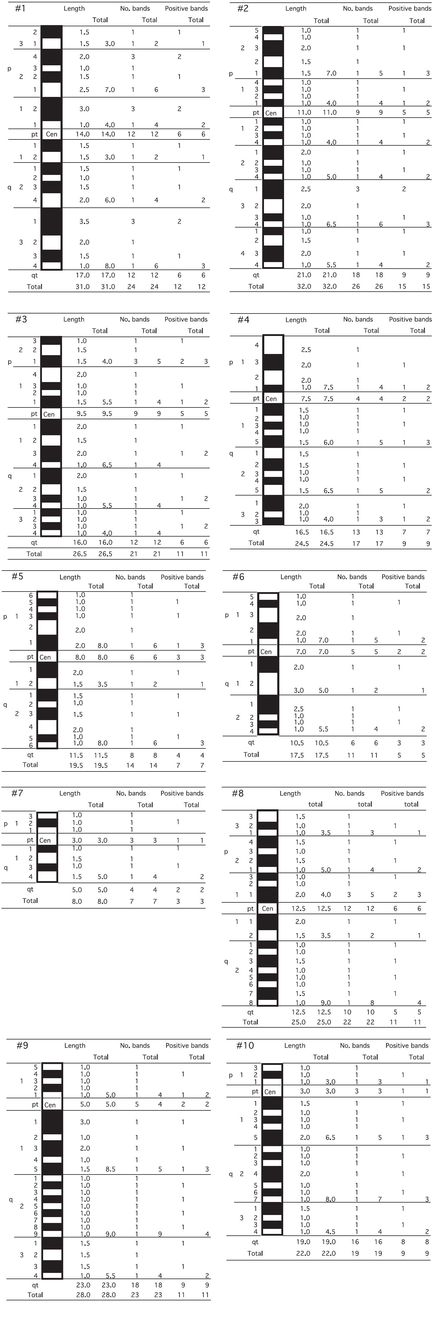 of the shortest band is represented as 1.0. The total number of bands is 184. Cen, centromere. Total, summation of length and number