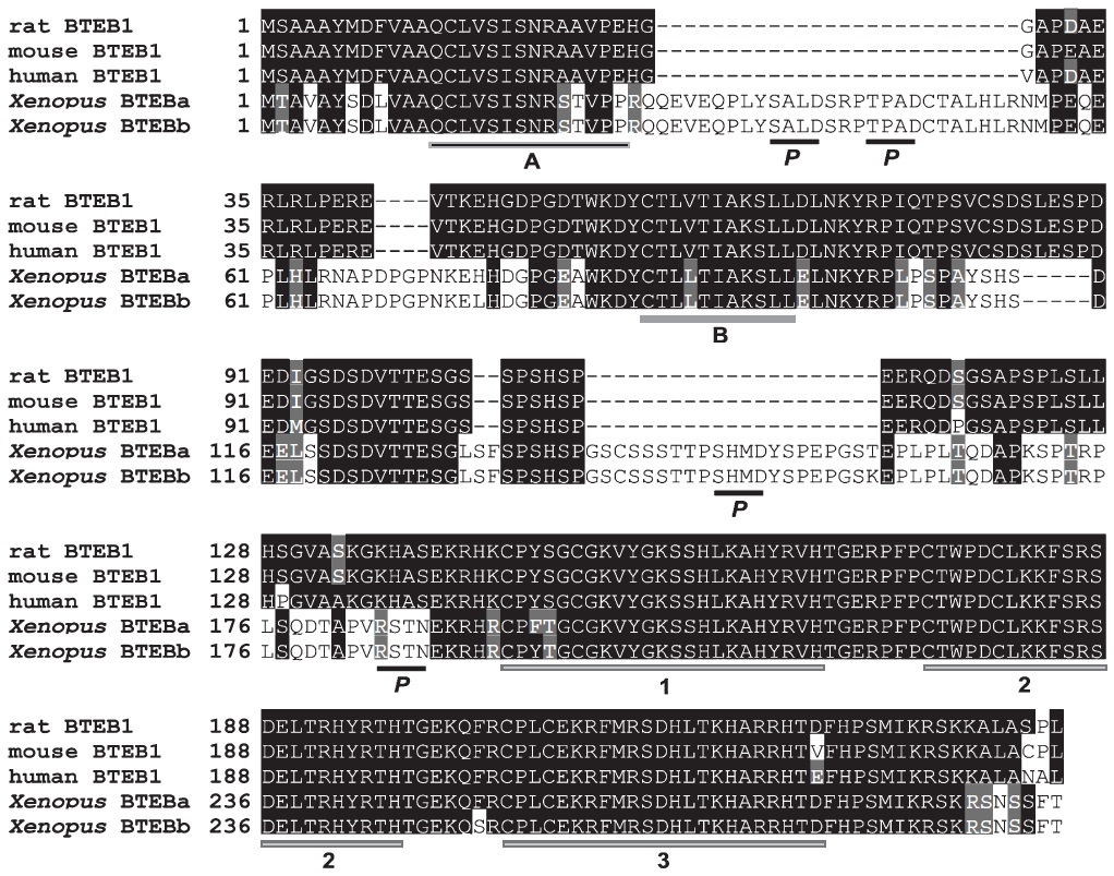 three zinc fingers (1, 2 and 3; DNA-binding domain). Four putative phosphorylation sites are designated ‘P’. Black shading indicates