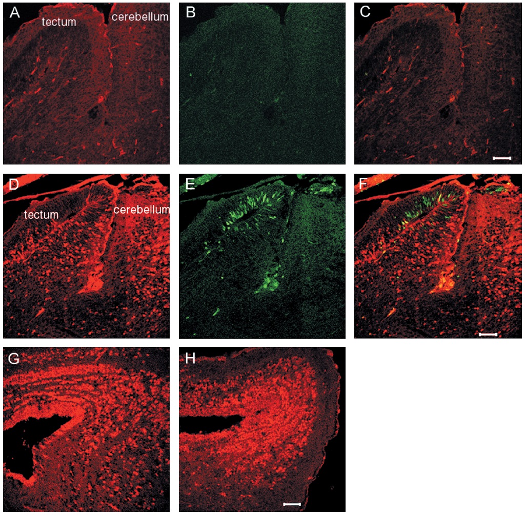 and BrdU (green; the optic tectum and cerebellum are