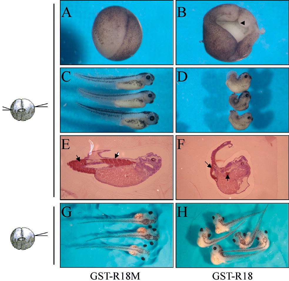 injected side (indicated by arrows) of GST-R18 injected embryos (D). (E,F)