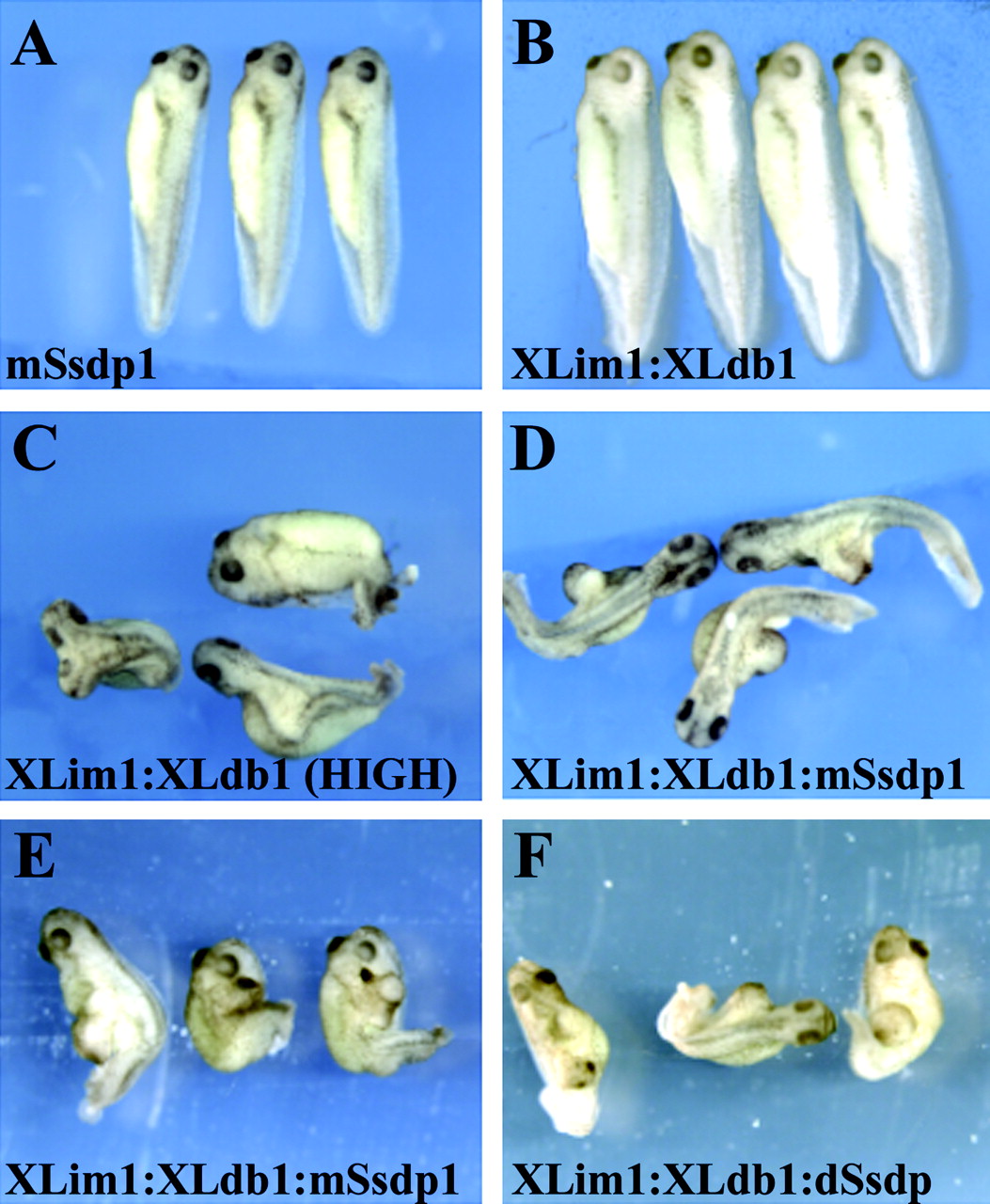 Examples of Xenopus embryos injected at the four-cell stage and photographed at stage 35/36. Different combinations of mRNAs, in amounts listed individually below, were injected into the prospective ventral marginal zone. (A) 100 pg mSsdp1; (B) 40 pg Xlim1, 40 pg Xldb1; (C) 400 pg Xlim1, 400 pg Xldb1; (D and E) 40 pg Xlim1, 40 pg Xldb1, 100 pg mSsdp1; (F) 40 pg Xlim1, 40 pg Xldb1, 100 pg dSsdp. In CâF, examples of embryos that did show secondary axes are illustrated; the percentages of embryos showing this phenotype are listed in Table 1.