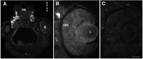dorsal; E, eye; Hb, hindbrain; NCC, neural crest cells; L, lens; OPL,