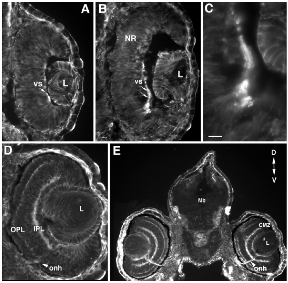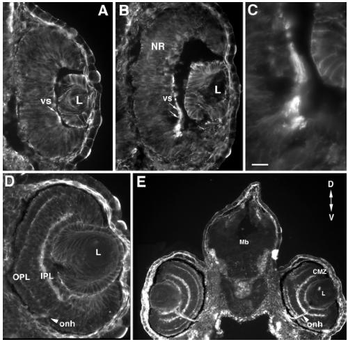 retina; onh, optic nerve head; V, ventral. Scale bar 50 m for A, B,