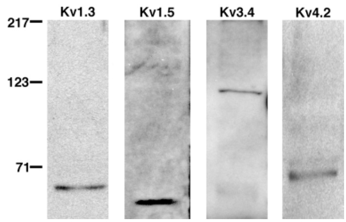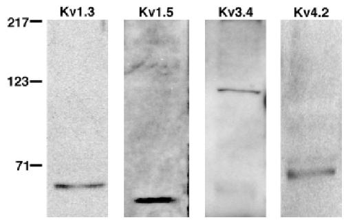 respective Kv channels. Lane 1: The Kv1.3 antibody detects a single