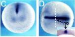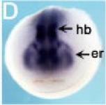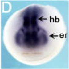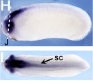 mig30 ( mig30) gene expression in Xenopus laevis embryo, assayed via in situ hybridization, NF stage 17, anterior view, dorsal up (E) and dorsal view, anterior right (G).