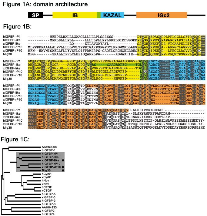 Figure 1. A: Schematic diagram of the protein domain architecture. Black, signal peptide (SP); yellow, insulin growth factor-binding homologues (IB, SMART accession no. 00121); blue, kazal-type serine protease inhibitors (KAZAL, SMART accession no. 00280); green, overlap of IB and KAZAL; orange, immunoglobulin C-2 type (IGc2, SMART accession no. 00408). B: Sequence alignment of hIGFBP-rP1 (GenBank accession no. NP_001544), xIGFBP-like (GenBank accession no. DQ515890), and xIGFBP-rP10 (GenBank accession no. AAH72910, Xenopus laevis MGC80370 protein) together with their human homologues (hIGFBP-like, GenBank accession no. NP_001007564; hIGFBP-rP10, GenBank accession no. NP_112191) and Mig30 (GenBank accession no. BAB84702). Note: The xIGFBP-like is not a full-length sequence. Conserved amino acids are shaded in gray. Dashes indicate gaps introduced to maximize the alignments. Protein domains are highlighted with same colors as in A. Note: The white box in the overlap of IB and KAZAL of hIGFBP-rP10 and white box in IB of xIGFBP-rP10 mark single amino acid substitutions (see the Results section). C: Cladogram of human and Xenopus laevis IGFBPs and IGFBP-rPs (see Table 1). The proteins characterized in this study (marked with a dot) together with their human homologues and hIGFBP-rP1 form a group (shaded in gray). For the putative Xenopus homologues of hIGFBP-1 and -2, GenBank accession numbers are AAH60008 and AAH84133, respectively. The tree was generated using ClustalW.
