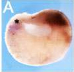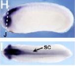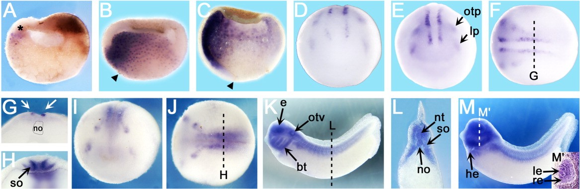 Figure 3. In situ hybridization of Mig30. Positions of sections are indicated by dotted lines, and letters mark corresponding panels. A-C: Sagittal sections; dorsal to the left. A: Stage (st.) 8.5; asterisk marks the blastocoele chordin- and noggin-expressing center. B,C: Black arrowheads mark the dorsal lip. B: St. 10.25. C: St. 11.5. D: St. 14; anterior view. E-G: St. 17. E: Anterior view. F: Dorsal view, anterior to the left. G,H: Transverse sections. I,J: St. 20. I: Anterior view. J: Dorsal view, anterior to the left. K,L: St. 31. K: Lateral view. L: Transverse section. M,M prime : St. 39. M: Lateral view. M prime : Transverse section. bt, branchial tissue; e, eye; he, heart; le, lens; lp, prospective lens placode; no, notochord; nt, neural tube; otp, prospective otic placode; otv, otic vesicle; re, retina; so, somite.