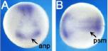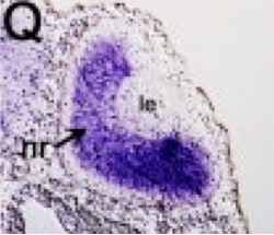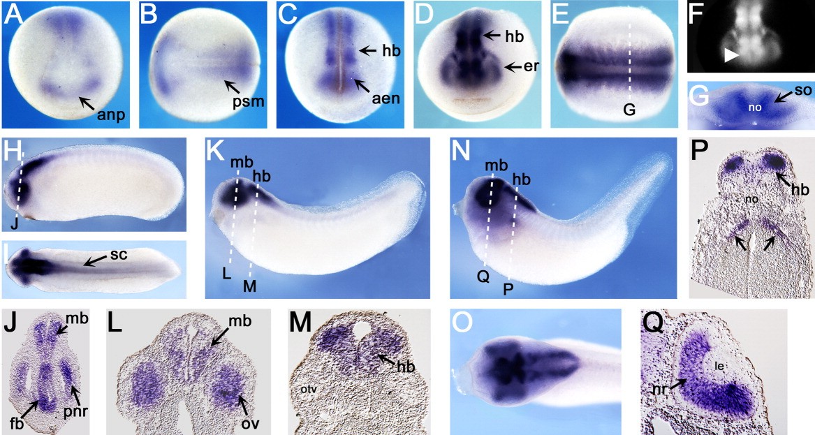 Figure 5. Whole-mount in situ hybridization of xIGFBP-like. Positions of sections are indicated by white dotted lines, and letters mark corresponding panels. A,B: Stage (st.) 15. A: Anterior view. B: Dorsal view, anterior to the left. C: St. 18; anterior view. D-G: St. 21. D: Anterior view. E: Dorsal view, anterior to the left. F: Reversed saturation image of D, to visualize pattern of strongly stained areas. G: Transverse section. H-J: St. 25. H: Lateral view. I: Dorsal view, anterior to the left. J: Transverse section. K-M: St. 32. K: Lateral view. L,M: Transverse sections. N-Q: St. 39. N: Lateral view. O: Magnification of head region, dorsal view, anterior to the left. P: Transverse section. Q: Transverse section. aen, archencephalic region; anp, anterior neural plate; er, prospective eye region; fb, forebrain; hb, hindbrain; le, lens; mb, midbrain; nr, neural retina; no, notochord; otv, otic vesicle; ov, optic vesicle; pnr, prospective neural retina; psm, presomitic mesoderm; sc, spinal cord; so, somite.