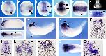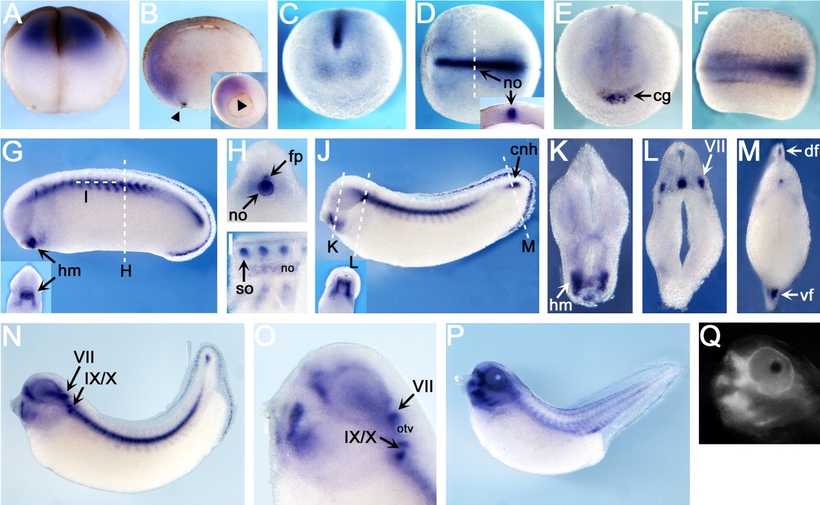 Figure 4. In situ hybridization of xIGFBP-rP10. Positions of sections are indicated by white dotted lines and letters mark corresponding panels. A,B: Sagittal sections. A: Stage (st.) 4. B: St. 10.5; black arrowheads mark dorsal lip; insert: vegetal view. C,D: St. 15. C: Anterior view. D: Dorsal view, anterior to the left; insert: transverse section. E,F: St. 21. E: Anterior view. F: Dorsal view, anterior to the left. G-I: St. 24. G: Lateral view; insert: vegetal view of head. H: Transverse section. I: Crude horizontal section at the level of the notochord. J-M: St. 30. J: Lateral view; insert: vegetal view of head. K-M: Transverse sections. N,O: St. 35; lateral view. O: Magnification of head region. P,Q: St. 40; lateral view. O: Magnification of head region; reversed saturation image of P, to visualize pattern of strongly stained areas. cg, cement gland; cnh, chordoneural hinge; df, dorsal fin; fp, floor plate; hm, head mesenchyme; no, notochord; otv, otic vesicle; so, somite; vf, ventral fin; VII and IX/X, cranial ganglia.