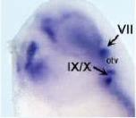mig30 (mig30) gene expression in Xenopus laevis embryo, assayed via in situ hybridization, NF stage 8.5, saggital section, anterior up.