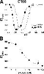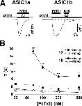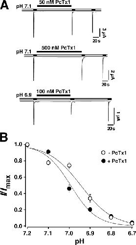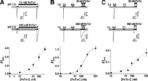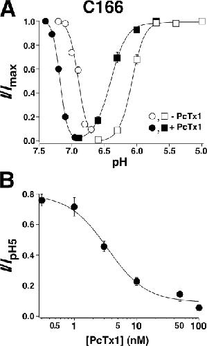 Figure 8. (A) PcTx1 robustly shifted the steady-state desensitization and activation curves of C166. pH50 of activation was pH 6.07 ± 0.05 (n = 7) in the absence of PcTx1 (open squares) and pH 6.40 ± 0.06 n = 5, in the presence of 100 nM PcTx1 (closed squares). pH50 of steady-state desensitization was pH 6.90 ± 0.01 (n = 5) in the absence of PcTx1 (open circles) and pH 7.17 ± 0.01 (n = 5) in the presence of 100 nM PcTx1 (closed circles). Solid lines are fits of the mean values of each data point to the Hill function (Eq. 1).(B) Concentration–response relationship for inhibition of C166 currents by PcTx1. Different concentrations of the toxin were applied for 120 s during the conditioning period with pH 7.1. The line represents a fit to the Hill equation (IC50 = 3.4 nM; n = 8–10).