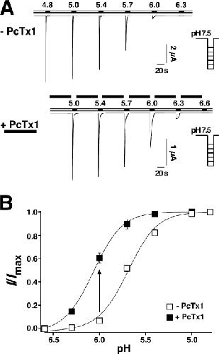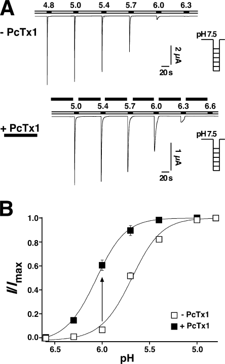 Figure 2. PcTx1 facilitated opening of ASIC1b. (A) Representative current traces elicited by pH ranging from 4.8 to 6.6 with conditioning pH 7.5 (applied for 60 s). Top, without PcTx1; bottom, with 100 nM PcTx1. (B) H+ dependence of ASIC1b activation in the absence (n = 7, open squares) or in the presence (n = 6, filled squares) of 100 nM PcTx1. Solid lines are fits of the mean values of each data point to a Hill function (Eq. 1). PcTx1 significantly (P < 0.01) shifted the pH activation curve to lower H+ concentrations. The arrow illustrates how PcTx1 potentiates currents at pH 6.0, as shown in Fig. 3 A.
