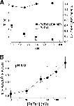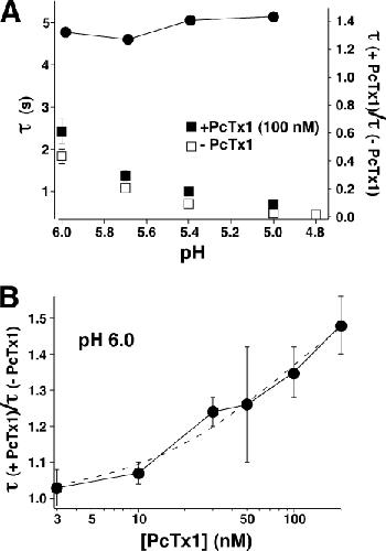 Figure 4. PcTx1 slowed down desensitization of ASIC1b. (A) Diagram showing the time constant of desensitization with and without 100 nM PcTx1 at different pH values (squares). Data are from measurements like the one shown in Fig. 2 A. The ratio of both time constants is shown in the same diagram (filled circles). It was not pH dependent. (B) Diagram showing the dependence of the ratio of the time constant of desensitization with and without PcTx1 at different concentrations of PcTx1. pH used to activate ASIC1b channels was always pH 6.0. Data are from measurements like the one shown in Fig. 3 A. The dashed line represents a fit to the Hill equation assuming an EC50 of 100 nM, as determined in Fig. 3, A and B.