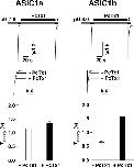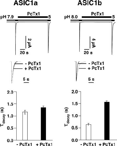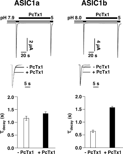 Figure 5. PcTx1 significantly prolonged the desensitization of ASIC1 currents. 500 nM PcTx1 slightly but significantly (P < 0.01, n = 5) slowed down desensitization of ASIC1a currents. Desensitization of ASIC1b currents was more strongly slowed down (P ≪ 0.01, n = 6). Conditioning pH was pH 7.9 for ASIC1a and pH 8.0 for ASIC1b, respectively. Acidic test pH was always pH 5.0. Top, examples of current traces. Scaled overlaid traces before and after PcTx1 application are shown for better comparison. Bottom, bars representing desensitization time constants of ASIC1 currents before and after PcTx1 application.