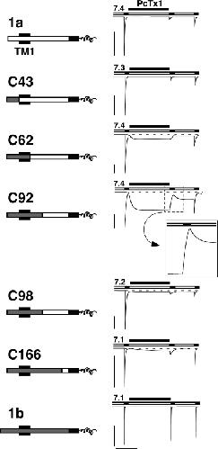 Figure 7. PcTx1 inhibits chimeras between ASIC1a and 1b. Left, chimeras are schematically drawn. NH2-terminal sequences from ASIC1a are shown as open bars, those from ASIC1b as gray bars. The first transmembrane domain TM1 is indicated as a black box and the common COOH terminus is shown as a black bar; only its first part is shown. The chimeras did have a shorter NH2 terminus than ASIC1b; this shorter NH2 terminus corresponds to M3 in Bässler et al. (2001). However, since the missing part of the NH2 terminus of ASIC1b is supposed to be located in the cytoplasm and since chimera C43 interacted with PcTx1 like ASIC1a, this NH2-terminal part does not seem to have any strong influence on the interaction with PcTx1. Right, PcTx1 strongly inhibited the currents of ASIC1a and all chimeras, but not of ASIC1b. Conditioning pH was chosen according to the pH50 of steady-state desensitization of each channel. Acidic test pH was always pH 5.0. PcTx1 (50 nM) was applied in the conditioning period for 120 s. Note the opening of chimeras C61, C92, C98, and C166 by application of PcTx1. The transient decrease in current amplitude with C92, after washout of PcTx1 and application of pH 5.0, is enlarged. Scale bars correspond to 5 μA and 60 s, respectively. Peak current amplitudes (mean ± SD) were −11.6 ± 6.1 μA for ASIC1a (n = 7), −35.9 ± 18.2 μA for C43 (n = 6), −8.4 ± 9.9 μA for C61 (n = 6), −12.3 ± 4.5 μA for C91 (n = 5), −12.0 ± 4.0 μA for C98 (n = 3), −11.4 ± 3.1 μA for C166 (n = 5), and −11.1 ± 6.0 μA for ASIC1b (n = 9).