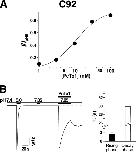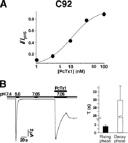 Figure 9. (A) Concentration–response relationship for activation of chimera C92 by PcTx1. Different concentrations of the toxin were coapplied with pH 7.05 for 40 s (n = 5–6). The line represents a fit to the Hill equation (EC50 = 11 nM). (B) PcTx1 robustly opened chimera C92. Left, 100 nM PcTx1 was coapplied with pH 7.05 (n = 6). pH 7.05 alone did not open C92. Note the rebound of the current amplitude after returning to pH 7.4. Right, bars representing time constants of the rising and of the decay phase of the current.