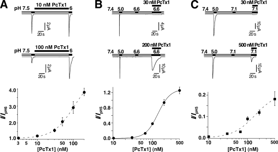 Figure 3. (A) PcTx1 potentiated ASIC1b currents elicited by pH 6.0. Top, representative current traces. Conditioning pH was 7.5. PcTx1 was applied in the conditioning period for 120 s. Bottom, concentration–response relationship (n = 5–9). Fit to the Hill equation revealed half-maximal potentiation at 101 nM (dashed line). Since a maximal response was not reached, this EC50 value provides a lower limit for the apparent affinity. (B) PcTx1 directly and robustly opened ASIC1b. Top, different concentrations of PcTx1 were coapplied with pH 6.6. pH 6.6 alone did not open ASIC1b. Bottom, concentration–response relationship. Solid line represents a fit to the Hill equation and revealed half-maximal potentiation at 139 nM (n = 4–8). (C) PcTx1 directly opened ASIC1a. Top, different concentrations of PcTx1 were coapplied with pH 7.1 (n = 4–10). pH 7.1 alone did not open ASIC1a. Bottom, concentration–response relationship. Fit to the Hill equation revealed half-maximal potentiation at 156 nM (dashed line), providing a lower limit for the apparent affinity.