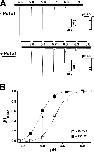 Figure 1. PcTx1 did not strongly inhibit ASIC1b. (A) ASIC1b currents were repeatedly activated by pH 5.0 for 10 s. Even 500 nM PcTx1 did not inhibit the current, when it was applied at pH 7.1 (n = 5). When applied at pH 6.9, 100 nM PcTx1 slightly inhibited the current (n = 6). (B) H+ dependence of steady-state desensitization of ASIC1b currents in the absence (n = 6, open circles) or presence (n = 6, filled circles) of 100 nM PcTx1. PcTx1 was applied for 120 s in the conditioning period; available channels were assessed with pH 5.0. Solid lines are fits of the mean values of each data point to a Hill function (Eq. 1). PcTx1 slightly but significantly (P = 0.04) shifted the steady-state desensitization curve of ASIC1b leftwards.