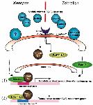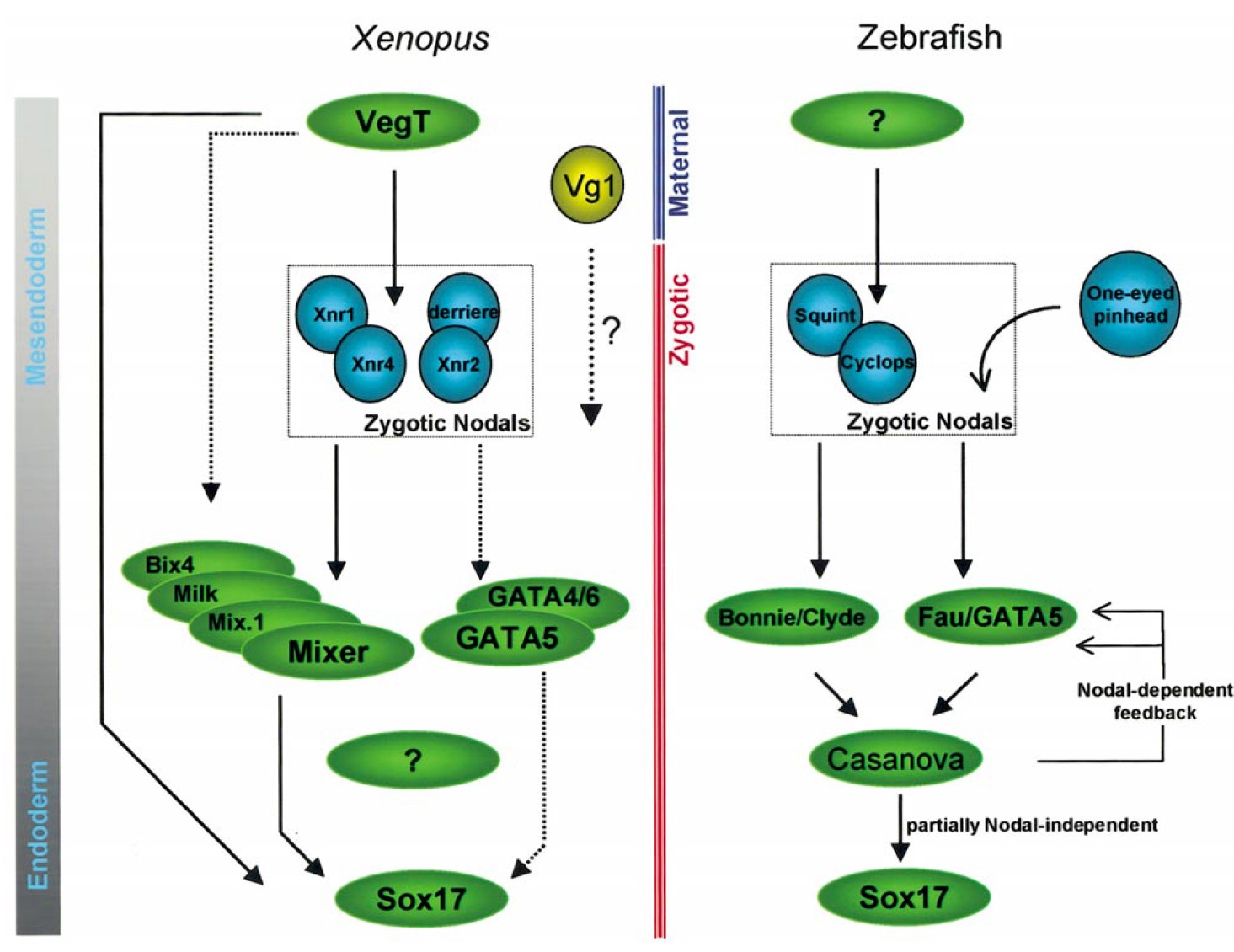 endoderm differentiation in X. laevis (left) and D. rerio (right). Maternal (top) and zygotic (bottom) determinants are indicated, and the