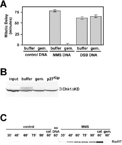 Figure 3. The initiation of DNA replication is required to generate the MMS damage signal. (A) Cycling extracts were prepared and supplemented with either PBS (buffer) or recombinant geminin (gem.). The samples were then further supplemented with either sperm chromatin (control DNA), MMS-treated sperm chromatin (MMS DNA) or sperm chromatin and plasmid DNA that had been linearized by restriction enzyme digestion (25 ng/μl; DSB DNA). Entrance into mitosis was determined as in Fig. 1 A, and the data are plotted as in Fig. 1 A. (B) Cycling egg extracts were prepared and supplemented with cyclohexamide and either PBS (buffer), recombinant geminin (250 nM; gem.), or recombinant p27Kip (500 nM). Extracts were further supplemented with MMS-treated chromatin and 35S-labeled Chk1 ΔKD protein. After a 60-min incubation, samples were recovered for SDS-PAGE. The input lane shows the Chk1 ΔKD protein before incubation with Xenopus egg extract. (C) Cycling extracts were prepared and supplemented with cyclohexamide and either control, undamaged sperm chromatin, or MMS-treated sperm chromatin. Chromatin was isolated from these extracts at the indicated times (in minutes), and probed for the presence of Rad17 using anti–Xenopus Rad17 antibodies. Where indicated, the samples also included caffeine (caf., at 5 mM) or recombinant geminin (gem., at 250 nM). The sample labeled no DNA refers to a sample that was processed in the absence of any sperm chromatin addition, showing that Rad17 recovery is dependent on the addition of chromatin. Sperm chromatin was added to 2,000/μl in all samples.