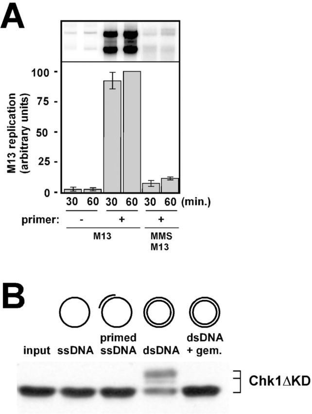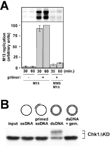 Figure 4. Replication structures specific for dsDNA replication are required to generate the MMS damage signal. (A) M13 ssDNA was annealed to an oligonucleotide primer, or not, and then incubated in NPE containing [32P]dATP (final concentration of M13 ssDNA was 5 ng/μl). Additionally, M13 ssDNA was alkylated, annealed to a primer, and incubated in NPE at 5 μg/ml. After either 30 or 60 min, aliquots were removed from the reaction and processed for DNA replication analysis on agarose gels. The top portion of the figure shows the gel, and beneath it is a bar graph showing the values obtained after analysis of the scanned gel on a Phosphorimager. After quantification of the data by Phosphorimager analysis, the value for the 60-min time point for M13 ssDNA plus primer was set to 100, and all other data were normalized accordingly. (B) NPE was supplemented with recombinant, bacterially expressed Chk1ΔKD at 5 ng/μl. The reactions were further supplemented with either alkylated M13 ssDNA (ssDNA), alkylated M13 ssDNA containing a preannealed oligonucleotide primer (primed ssDNA), or plasmid DNA that had been incubated previously in 0.5 vol of HSS either in the absence (dsDNA) or presence (dsDNA + gem.) of recombinant geminin (at 250 nM). After 60 min of incubation, samples were withdrawn and analyzed by SDS-PAGE, and immunoblotting for the phosphorylation status of Chk1ΔKD was performed. Chk1ΔKD was detected using a T7 mAb that recognizes the epitope tag supplied by the expression vector used to produce the recombinant Chk1ΔKD. Plasmid DNA was present at 25 ng/μl final concentration, whereas M13 DNA was present at 75 ng/μl final concentration. The input lane shows the Chkl1 ΔKD protein before incubation with Xenopus egg extract.