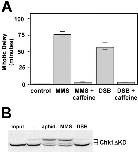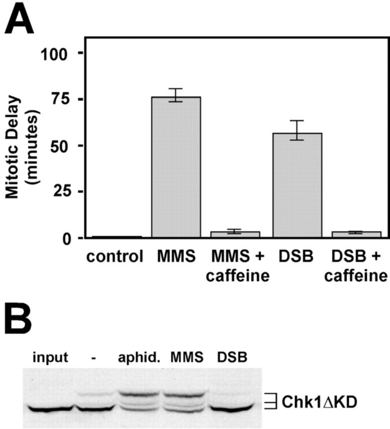 Figure 1. Alkylation damage of DNA activates the DNA damage checkpoint in Xenopus egg extracts. (A) Cycling extracts were prepared and supplemented with sperm chromatin (control), MMS-treated sperm chromatin (MMS), or sperm chromatin and linearized plasmid DNA at 25 ng/μl (DSB). Additionally, where indicated, 5 mM caffeine was also included. Extracts were incubated at RT and examined for entrance into mitosis by DAPI staining of nuclei to visualize nuclear envelope breakdown. An extract was scored as mitotic when >50% of the nuclei had undergone nuclear envelope breakdown. The data are plotted as mitotic delay, which is the difference in time between entrance into mitosis for the control extract and entrance into mitosis for the experimental extracts. Control extracts typically required 55–70 min to enter mitosis. All samples contained 2,000 sperm nuclei/μl. (B) 35S-labeled Chk1 ΔKD protein (Michael et al., 2000) was added to cycling egg extracts along with the following: sperm chromatin and no further additions (-), or sperm chromatin and aphidicolin (100 μg/ml; aphid.), MMS-treated chromatin (MMS), or sperm chromatin and plasmid DNA that had been linearized by restriction enzyme digestion (25 ng/μl; DSB). After a 60-min incubation, samples were recovered and analyzed by SDS-PAGE for mobility shifts of the labeled proteins. The input lane shows the Chk1 ΔKD protein before incubation with Xenopus egg extract.