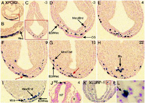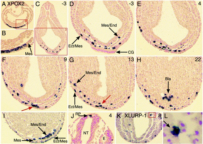 Fig. 3. Transverse sections (10 μm) through Xenopus tailbud stage embryos after whole-mount in situ hybridisation for POX2 (AâJ) or LURP-1 (K,L). (A) Section through the centre of the XPOX2 expression domain of a stage 20 embryo, showing the location of the high magnification detail (B). A stage 25 embryo (C) shows the relative location of five ventral-half view images (DâH) that are representative sections marking progressively posterior slices. Sections are numbered (top right of each panel) commencing from the posterior limit of the cement gland. Red arrows mark the ventral-most XPOX2-expressing mesodermal cells within the heart-forming region. (I,J) Sections of stage 27 embryos showing a ventral-half view of the posterior trunk (I) and a dorsal-half view at the level of the eye (J). Ventral-half view of a stage 28 embryo (K) gives the location of a detail (L), which depicts a cell that expresses XLURP-1 located between mesodermal and endodermal layers that was fixed while it apparently phagocytosed cell material from the endoderm (L, black arrow). Additionally, this phagocyte formed such tight contacts with two mesodermal cells that they were prised away from the bulk of the mesoderm as the germ layers became separated during the sectioning procedure. All sections have been counterstained to reveal cell nuclei. Red boxes mark the location of detail images. Ect/Mes, expressing cells located between ectodermal and mesodermal germ layers; Mes/End, expressing cells located between mesodermal and endodermal layers; CG, cement gland; Bla, remnant of the blastocoel cavity; RP, roof plate; NT, neural tube; E, eye.