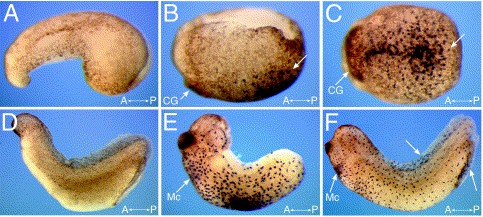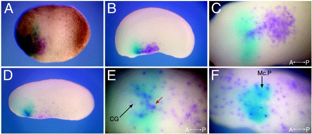 Fig. 4. XPOX2 expression within embryo explants. Left-lateral views of representative posterior-dorsal (A) and anterior-ventral (B) embryo dissections fixed at stage 21 and assayed for XPOX2 expression by in situ hybridisation. (C) Ventral view of the same fragment shown in (B). Arrows indicate the posterior limit of the XPOX2-expressing cells. Left-lateral views of posterior-dorsal (D) and anterior-ventral (E) dissections that were cultured till stage 33 and assayed as before. (F) Control stage 33 embryo with XPOX2-positive cells present in posterior and dorsal locations (arrows). The position of the myocardium (Mc) of the forming heart was also assayed by MLC2 expression (Chambers et al., 1994) in this experiment (E,F). Pigmented-wildtype embryos were used for this experiment. CG, cement gland; A, anterior; P, posterior.