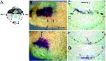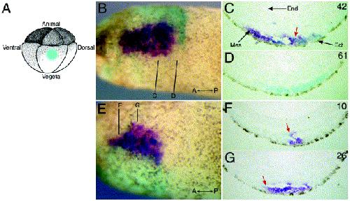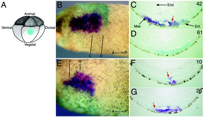 Fig. 11. XPOX2 expression in progeny cells of the dorsal-vegetal blastomeres. (A) Diagram illustrating the injection site of the cell-lineage marker, biotin-dextran (pale blue), into an individual dorsal-vegetal blastomere of an eight-cell stage Xenopus embryo. The animal and vegetal poles, and the dorsal-ventral axis, are indicated. The embryos were allowed to develop until stages 22â23, whereupon they were fixed and assayed for XPOX2 mRNA expression, and stained to reveal the daughter cells of the injected blastomere. In 27 correctly targeted embryos, when viewed from the ventral side (Lane and Smith, 1999), we observed two subtly different juxtapositions of myeloid gene expression and the posterior boundary of the dorsal-vegetal progeny cells, which are shown (BâD,EâG). Nevertheless, with both observed configurations, the myeloid cells are wholly derived from the dorsal-vegetal blastomeres. The converse cell-fate mapping experiment of ventral-vegetal blastomere cell-lineage injection never resulted in ventrally derived mesoderm present within the domain of myeloid cells at stage 22 (data not shown). (B,E) Ventral views of the site of myeloid cell development for such representative tailbud embryos showing the progeny cells of the dorsal-vegetal blastomere (pale blue) and XPOX2 expression (magenta). The stage 22 embryo (B) has left-sided lineage staining while the stage 23 embryo (E) has right-sided lineage staining. Black lines indicate the positions of the transverse sections illustrated (C,D,F,G). Red arrows (C,F,G) on the sections mark mesodermal regions of coincident cell-lineage staining and XPOX2 expression, which appears a dark blue colour. Sections (10 μm) are numbered (top right of each panel) commencing from the anterior limit of the XPOX2 expression domain. Pigmented-wildtype embryos were used for this experiment. A, anterior; P, posterior; Ect, ectoderm; Mes, mesoderm; End, endoderm.