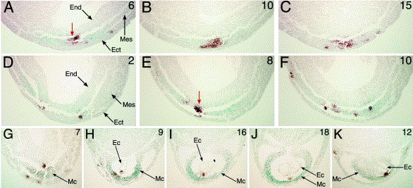 Fig. 8. Transverse sections through the heart-forming region of Xenopus embryos after double whole-mount in situ hybridisation for the two markers of cardiogenesis (in pale blue), Nkx2-5 (AâF) and MLC1av (GâK), in combination with POX2 (magenta). (AâC) Three representative sections marking progressively posterior slices through the same stage 24 embryo depicted in Fig. 7(B,C). (DâF) Three progressively posterior sections through the stage 26 embryo depicted in Fig. 7(D,E). Red arrows mark the ventral-most XPOX2-expressing mesodermal cells within the heart field. (G) Transverse section through the myocardial plate of a stage 30 embryo. (HâJ) Three progressively posterior sections through the myocardium of a stage 32 embryo. (K) Transverse section through the looping heart tube of a stage 35 embryo. Sections (10 μm) are numbered (top right of each panel) commencing from the posterior limit of the cement gland (AâC and DâF) or the anterior limit of the myocardium (GâK). Ect, ectoderm; Mes, mesoderm; End, endoderm; Mc, myocardium; Ec, endocardium.
