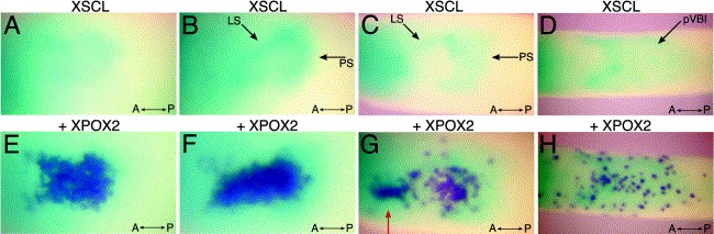 Fig. 9. XPOX2 expression in the anterior VBI. Double whole-mount in situ hybridisation for the haematopoietic transcription factor, SCL (pale blue), in combination with POX2 (magenta). Embryos were photographed successively after the colour reactions for the SCL (AâD) and POX2 (EâH) probes were developed. High magnification ventral views of the site of myeloid cell development at stages 20 (A,E), 22 (B,F) and 24 (C,G). (D,H) High magnification ventral views of the trunk of a stage 28 embryo showing the posterior VBI. LS, lateral SCL expression; PS, posterior SCL expression; pVBI, posterior ventral blood island; A, anterior; P, posterior; red arrow, narrow rostral POX2 expression within heart field.