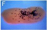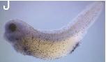 Fig. 2. Whole-mount in situ hybridisation analysis of Xenopus POX2 (AâH,L), LURP-1 (I,J) and L-plastin (K) expression. Right-lateral views of stage 19 (A), 24 (C) and 27 (E) embryos showing XPOX2-expressing cells. (B,D,F) Ventral views of the same embryos depicted in (A,C,E). (G) Higher magnification image of the stage 27 embryo depicted in (F) to illustrate the streams of XPOX2-expressing cells that emanate from a focal point (red arrow) located at the ventral midline within the heart-forming region. (H) Right-lateral view of a stage 30 embryo. (I,J) Left-lateral views of embryos at stages 24 and 36, respectively, showing cells that express XLURP-1. (K,L) Right-lateral view of the posterior trunk of a stage 35 tadpole after sequential, double whole-mount in situ hybridisation staining to reveal first (K), Xenopus L-plastin (pale blue) and second (L), POX2 (magenta) expression. The co-localisation of the two chromogenic reagents results in a dark blue colour (L). A, anterior; P, posterior.