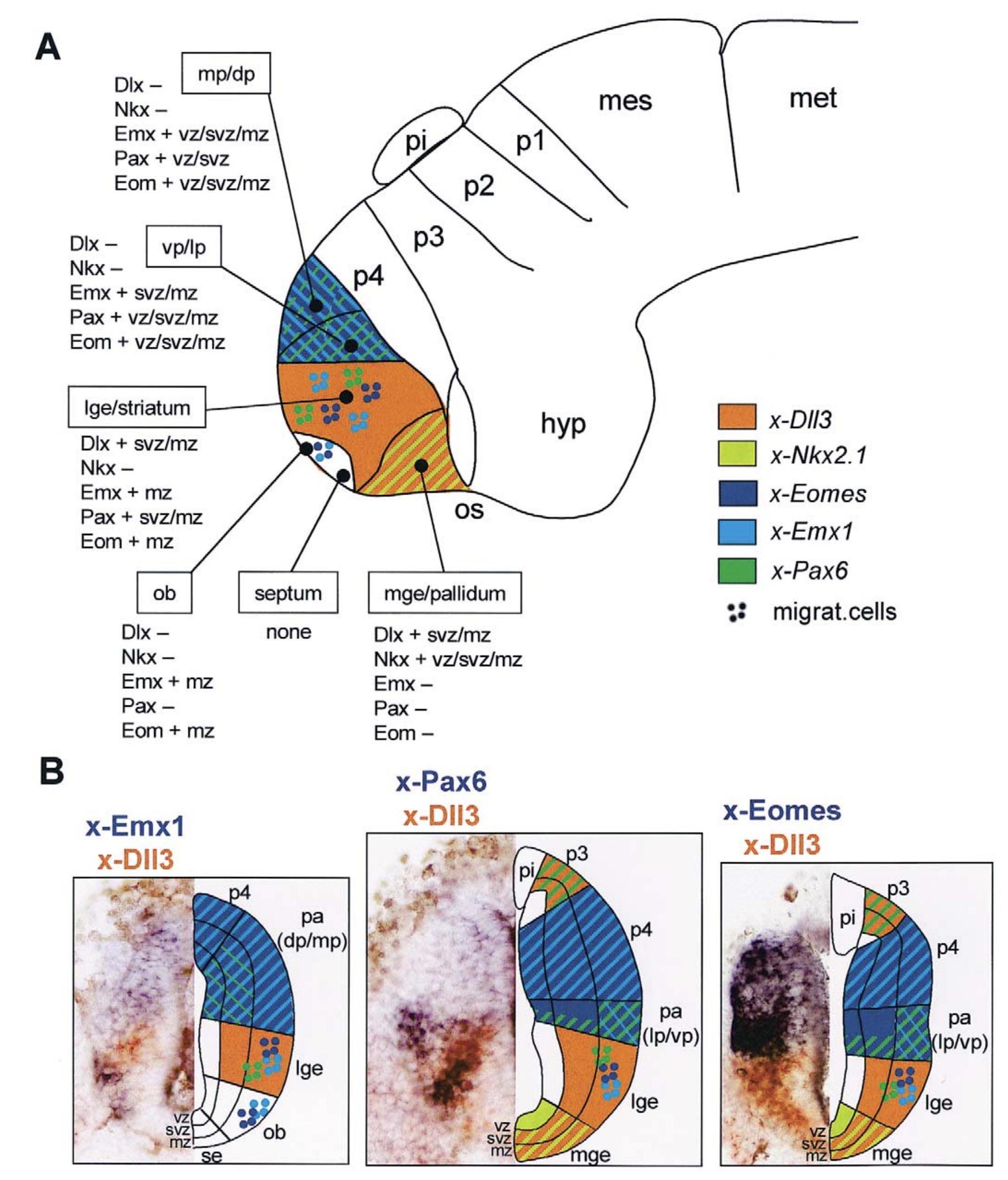 Fig.5. Model summary of Xenopus embryonic forebrain subdivisions deduced from expression of x-Dll3, x-Nkx2.1, x-Emx1, x-Pax6 and x-Eomes. (A)