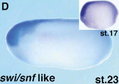 smarcc1 (SWI/SNF related, matrix associated, actin dependent regulator of chromatin, subfamily c, member 1) gene expression in Xenopus laevis embryos, NF stage 23 (stage 17 inset), as assayed by in situ hybridization. Lateral view: anterior left, dorsal up.