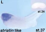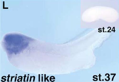 strn (striatin, calmodulin binding protein) gene expression in Xenopus laevis embryos, NF stage 37 (stage 24 inset), as assayed by in situ hybridization. Lateral view: anterior left, dorsal up.