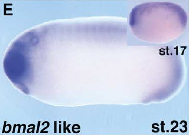 bmal2 (basic helix-loop-helix ARNT like 2) gene expression in Xenopus laevis embryos, NF stage 23 (stage 17 inset), as assayed by in situ hybridization, Lateral view, anterior left, dorsal up.