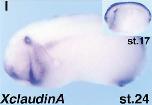 cldn6.2 (claudin 6, gene 2) gene expression in Xenopus laevis embryos, NF stage 24 (stage 17 inset), as assayed by in situ hybridization. Lateral view: anterior left, dorsal up.